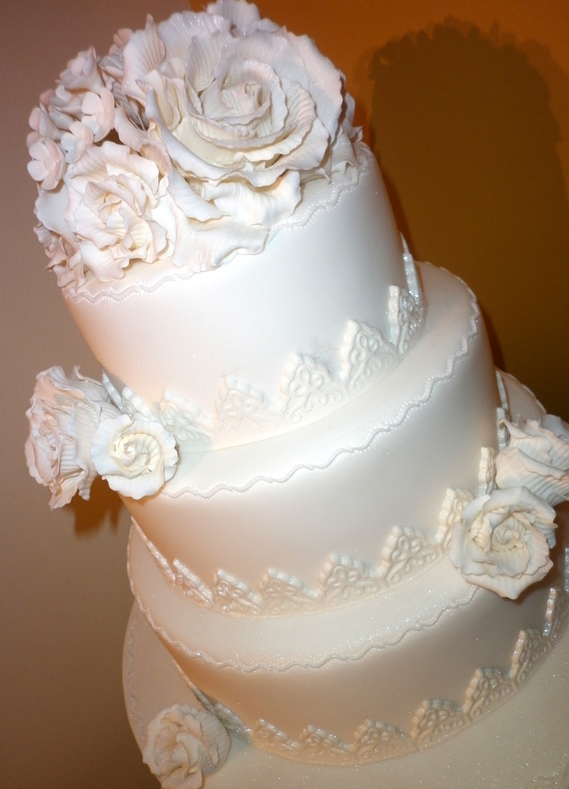 This is a dummy cake made for an upcoming wedding open day. Roses and flowers are made from sugarpaste.